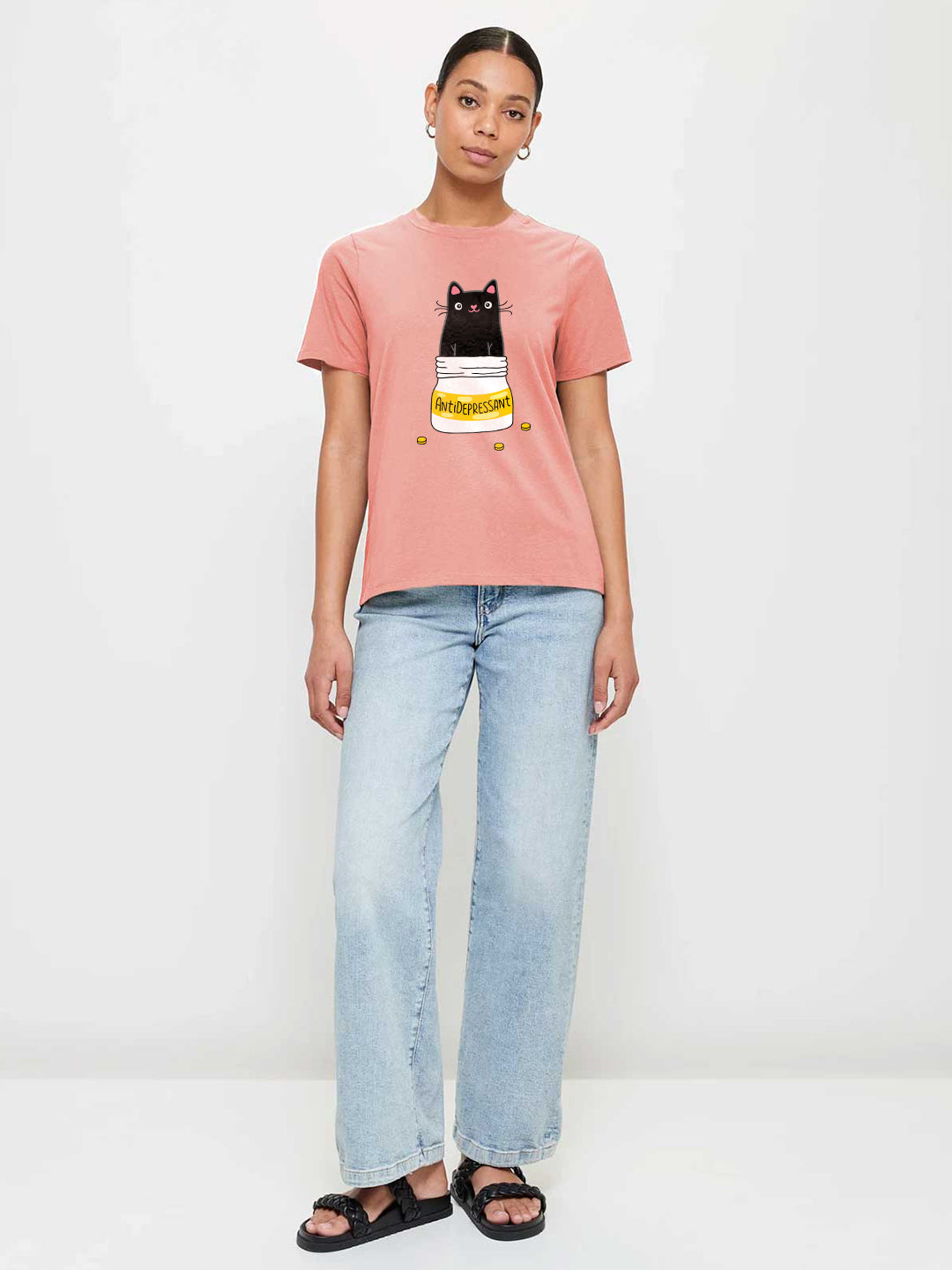 Upgrade your everyday style with this premium graphic T-shirt designed for comfort and a modern look. Made from cotton fabric. it’s perfect for casual wear all day long. Crew Neck Half Sleeves Regular Fit 180 GSM Fabric: 100% Premium Cotton Size: Model is wearing L size Country of Origin: Proudly Indian Washing Instructions: Machine wash. Do not iron directly or scrub on print. Dry on flat surface as hanging may cause measurement variations Color shown in the picture may vary from the actual product due to different lighting Product Description Express your quirky side with PRONK’s salmon pink Antidepressant Cat women’s half sleeve T-shirt. Buy online now from PRONK, available in XS to XXL size.