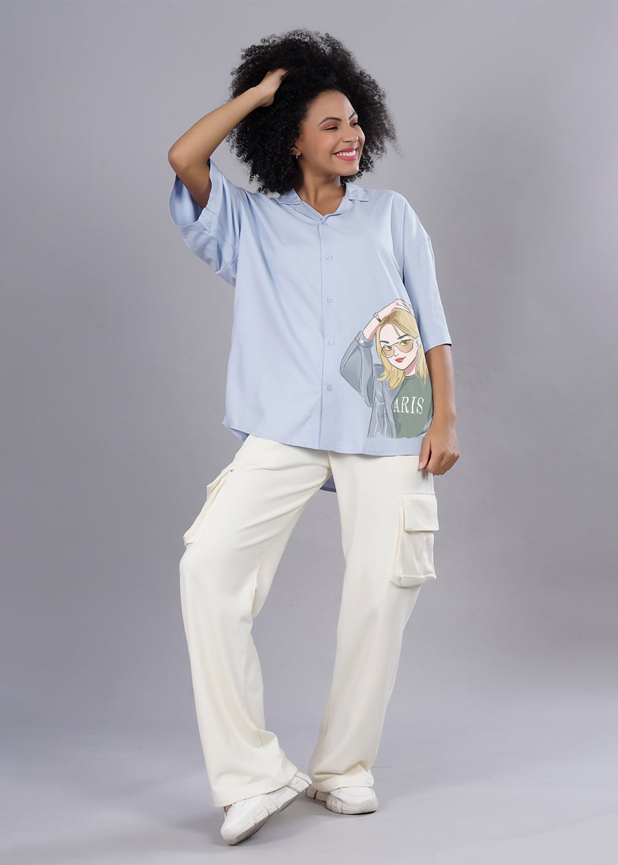 Half Sleeves Curved Bottom Hem Cuban Collar Country of Origin: Proudly Indian Fit: Oversized Fit Fabric: Fluidic Fabric | Sustainable thread used Washing Instructions: Cold machine wash only, flat dry in shade, do not wring Product Description Cool girl sky blue printed fluidic fabric oversized fit shirt for womens by Pronk at lowest prices. Available in XS,S,M,L,XL. Check out vast collection of oversized shirts at our website. Buy now! Color shown in the picture may vary from the actual product due to different lighting