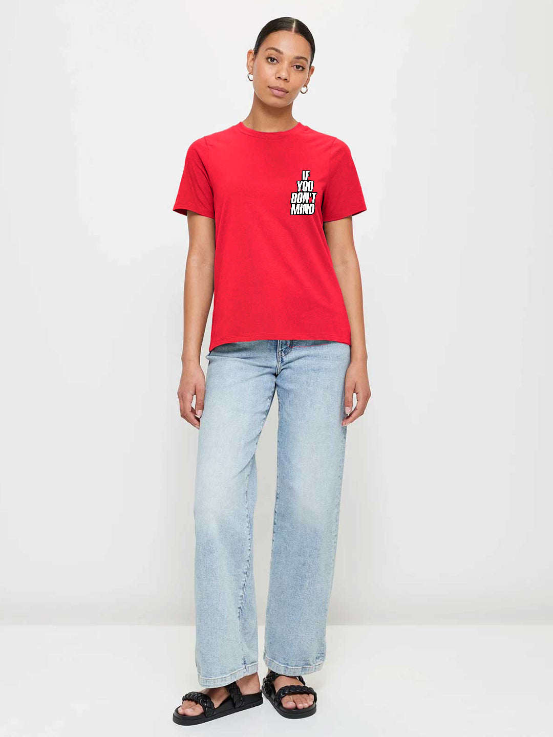 Upgrade your everyday style with this premium graphic T-shirt designed for comfort and a modern look. Made from cotton fabric. it’s perfect for casual wear all day long. Crew Neck Half Sleeves Regular Fit 180 GSM Fabric: 100% Premium Cotton Size: Model is wearing L size Country of Origin: Proudly Indian Washing Instructions: Machine wash. Do not iron directly or scrub on print. Dry on flat surface as hanging may cause measurement variations Color shown in the picture may vary from the actual product due to different lighting Product Description Shop candy red color don’t mind women half sleeve t-shirt online from PRONK. Available in XS to XXL size. Choose from the wide collection of womens topwear!