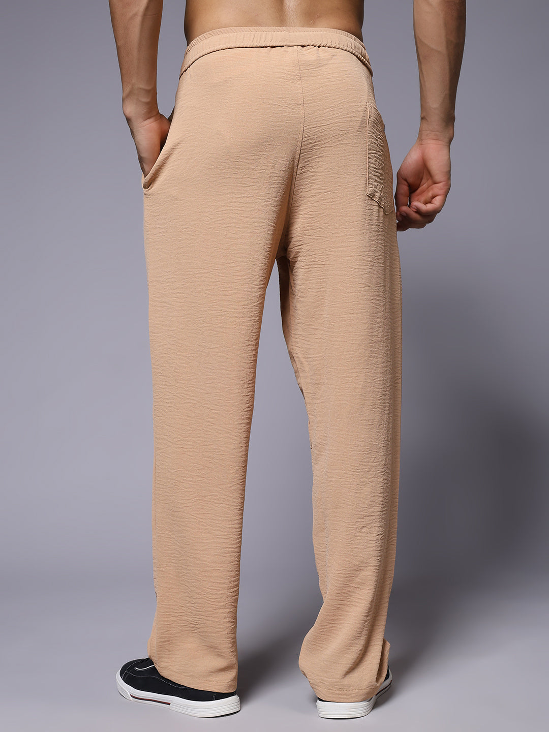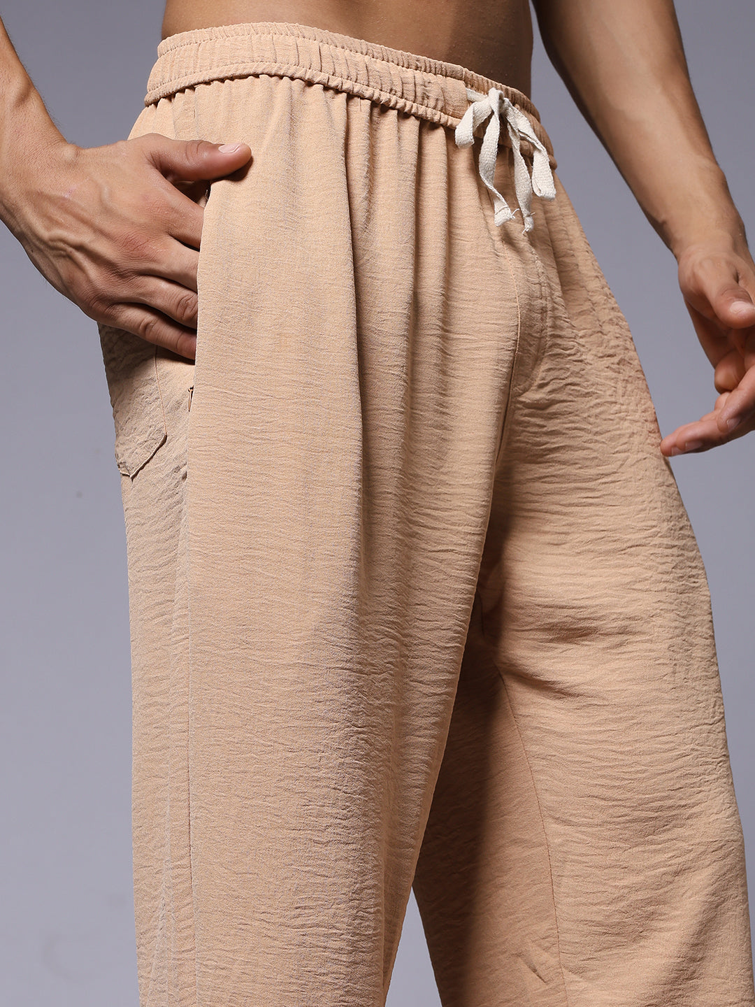 Stay comfortable and stylish with these Korean lounge pants for men. Designed for a relaxed fit. Specifications Occasion: Lounge Wear, Casual Outings, Travel Fit Type: Relaxed Fit Pattern: Solid, Crinkled Texture Material: Blended Linen Waistband: Elastic with Adjustable Drawstring Length: Full Length Pockets: 2 Side Pockets, 1 Back Pocket Size: Model is wearing L size Country of Origin: Proudly Indian Washing Instructions: Machine wash.  Color shown in the picture may vary from the actual product due to different lighting Product Description Elevate your style with beige color lounge pant for men Korean style online from PRONK. Available in S,M,L,XL size. Free Worldwide Shipping. Buy now!