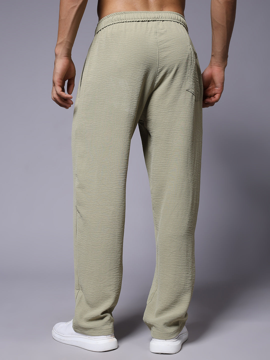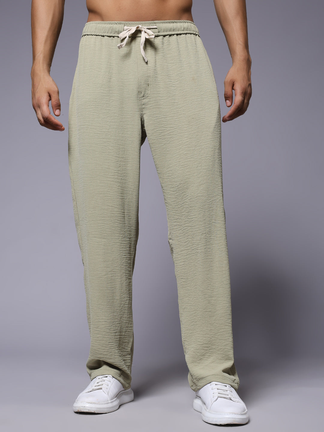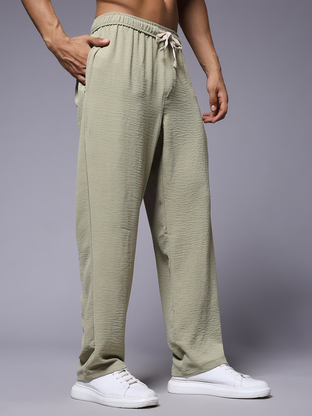Stay comfortable and stylish with these Korean lounge pants for men. Designed for a relaxed fit. Specifications Occasion: Lounge Wear, Casual Outings, Travel Fit Type: Relaxed Fit Pattern: Solid, Crinkled Texture Material: Blended Linen Waistband: Elastic with Adjustable Drawstring Length: Full Length Pockets: 2 Side Pockets, 1 Back Pocket Size: Model is wearing L size Country of Origin: Proudly Indian Washing Instructions: Machine wash. Color shown in the picture may vary from the actual product due to different lighting Product Description Get the best olive color lounge pant for men online from PRONK. Available in S,M,L,XL size. Choose from the premium lounge pants for men. Free Shipping!
