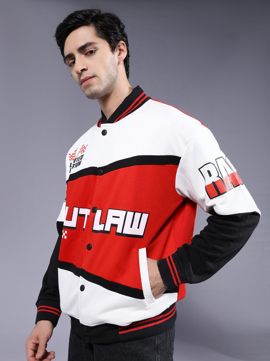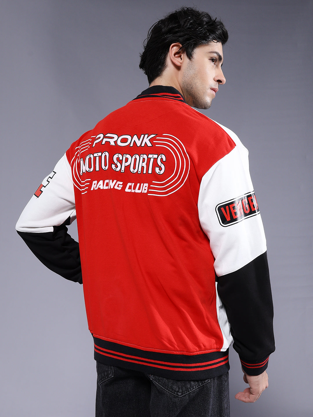 Step up your casual style varsity bomber jacket featuring bold graphic prints and striped ribbed detailing. Perfect for everyday wear, parties, or street fashion. Specifications  Sleeve Type: Full Sleeve Fit: Relaxed Fit Pattern: Graphic prints Material: 100% Cotton Terry  Neck Style: Ribbed Baseball Collar Closure: Front Button-Down Size: Model is wearing L size Country of Origin: Proudly Indian Washing Instructions: Machine wash.  Color shown in the picture may vary from the actual product due to different lighting Product Description Shop men graphic printed varsity bomber jacket  from Pronk online with free worldwide shipping. Choose from a wide range of trendy designs Jackets for men. Available in S,M,L,XL. Buy now!