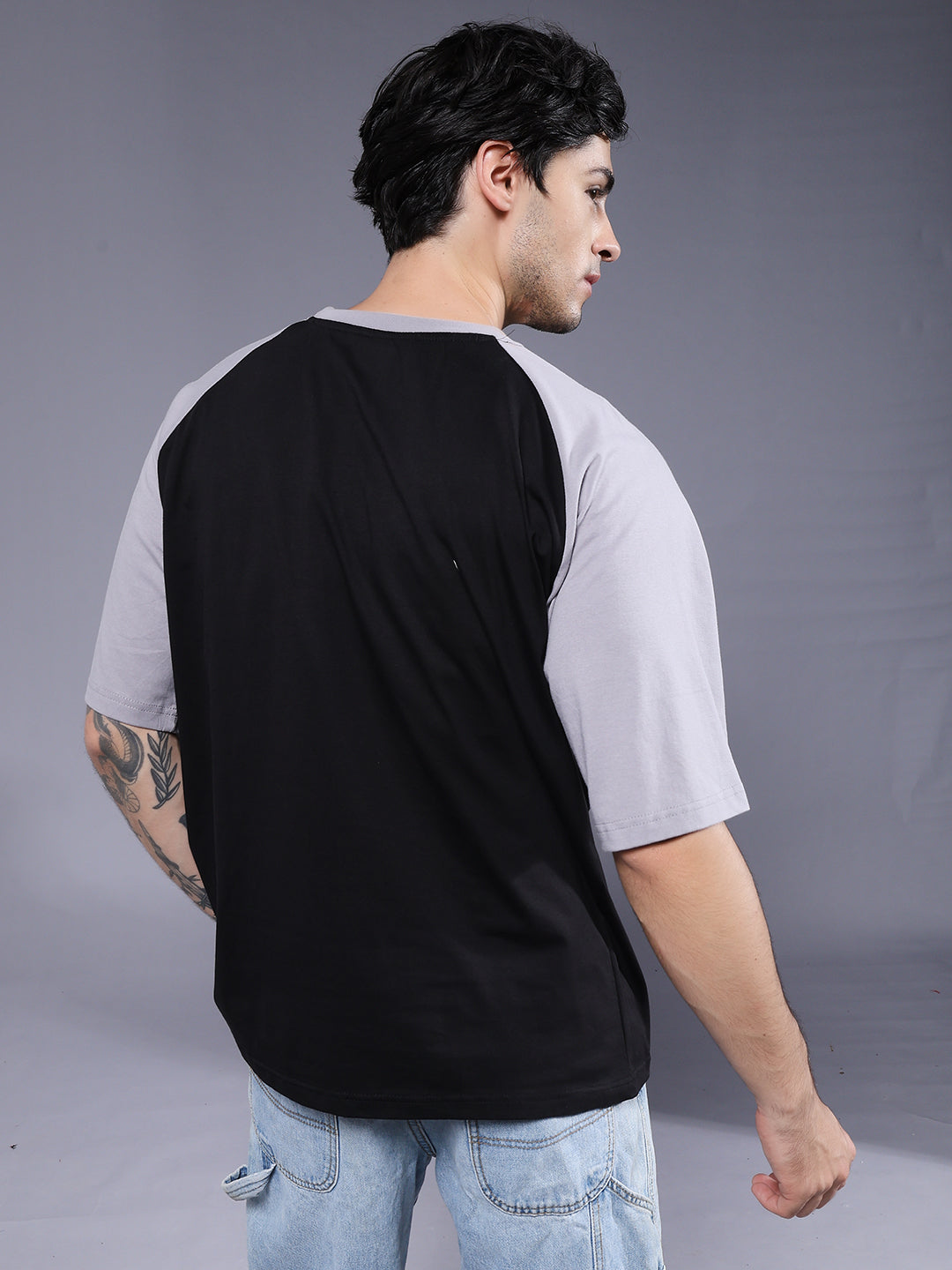 Product Description Men Oversized t-shirt with raglan sleeves and a relaxed fit for a trendy streetwear look. Crafted from soft and breathable fabric to keep you stylish and comfortable all day. Specifications Fit: Oversized Fit Pattern: Colorblock Material: 100% Cotton Neckline: Crew neck Sleeve Type: Half sleevesOccasion: Casual, streetwear Size: Model is wearing L size Country of Origin: Proudly Indian Washing Instructions: Machine wash cold, do not bleach Color shown in the picture may vary from the actual product due to different lighting