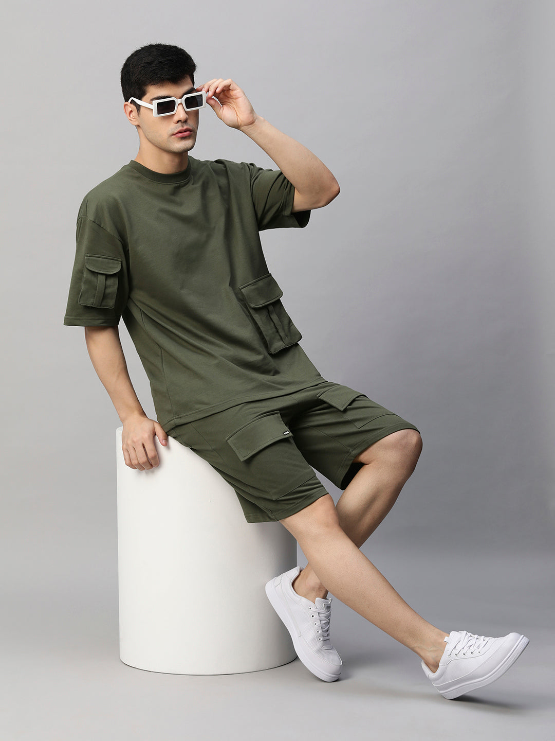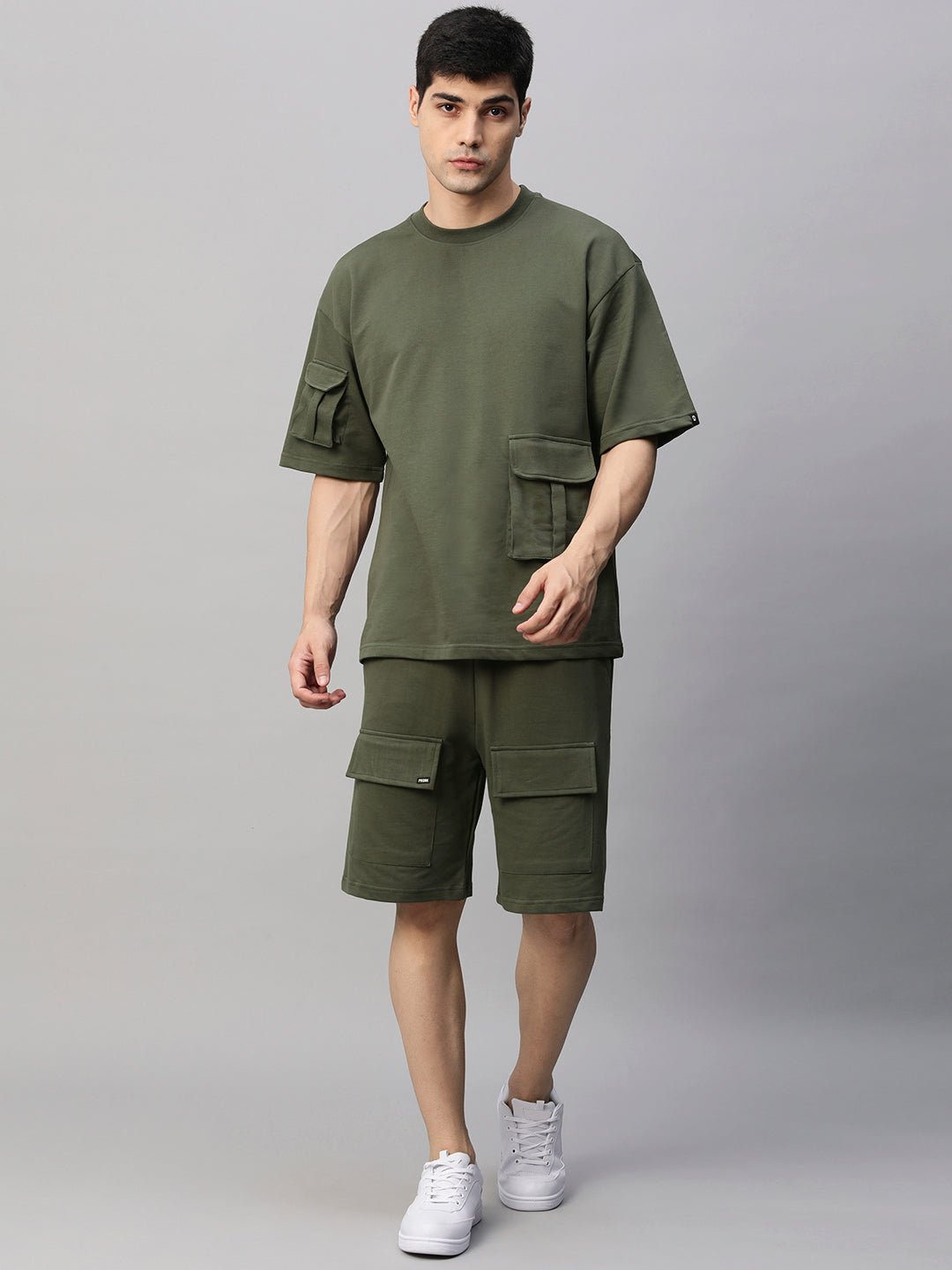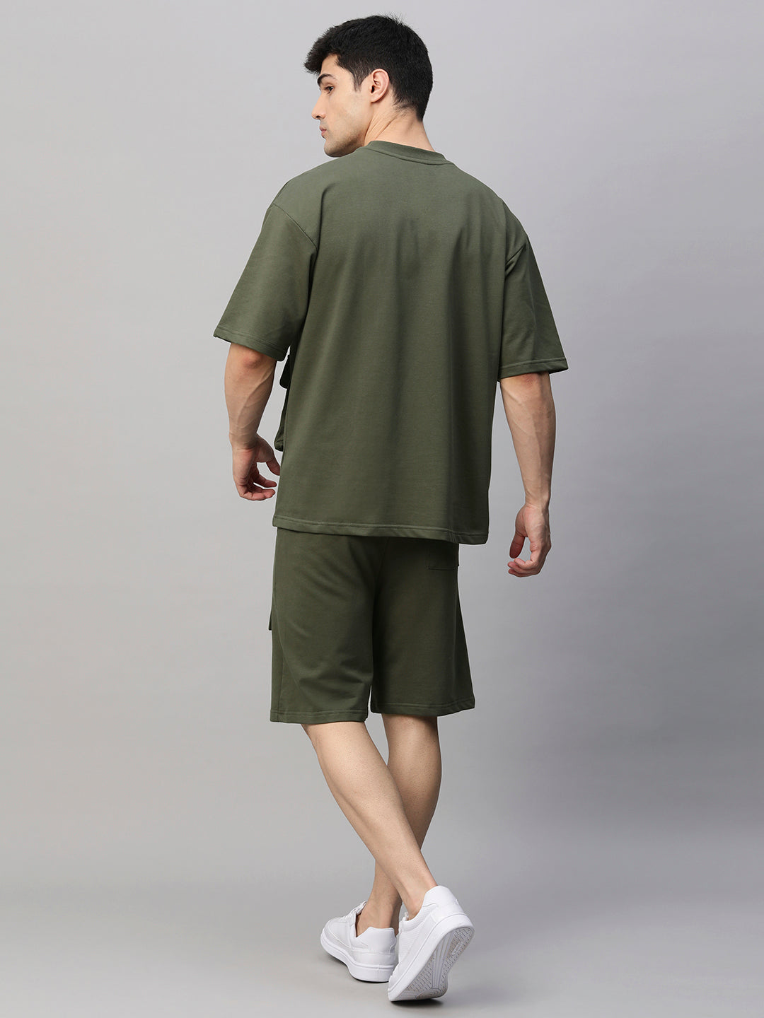 Co-ord Set Top : 240 GSM Bottom: 240 GSM Fit: Relaxed Fit Fabric: 100% Premium Cotton Terry Size: Model is wearing L size Country of Origin: Proudly Indian Washing Instructions: Machine wash. Do not iron directly or scrub on print. Dry on flat surface as hanging may cause measurement variations Contents: Package Contains 1 Cargo T-Shirt And 1 Cargo Shorts Product Description Shop stylish and trendy olive green men premium cargo co-ord set online from PRONK India’s fastest growing fashion brand. Available in S,M,L,XL size. Explore the wide collection of co-ord set for men at PRONK. Free shipping!
