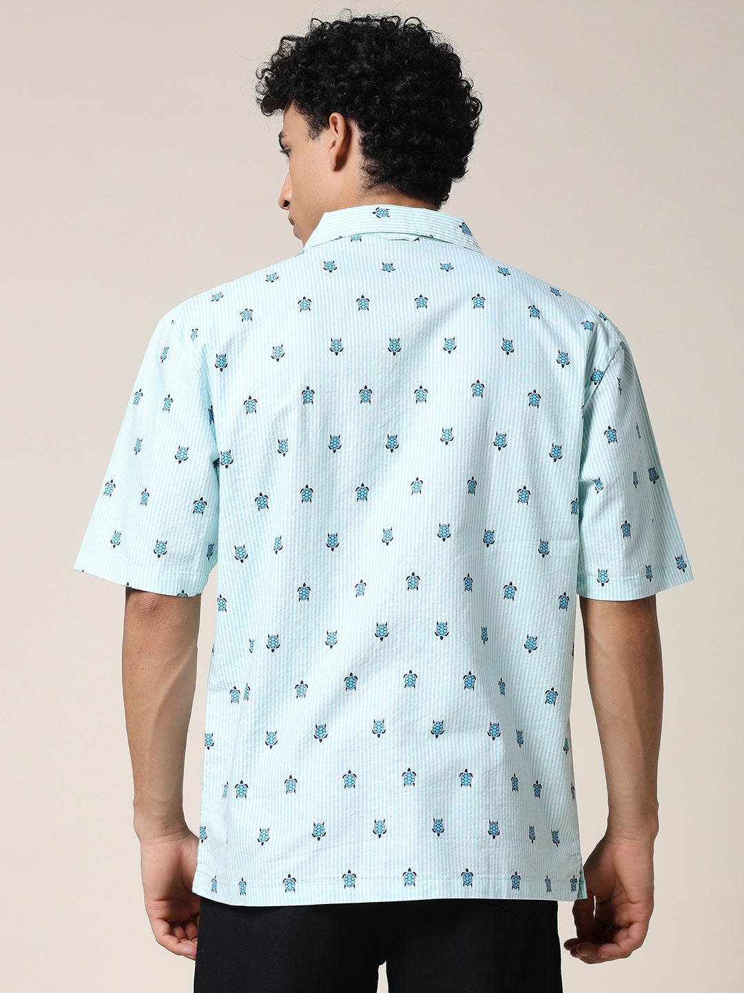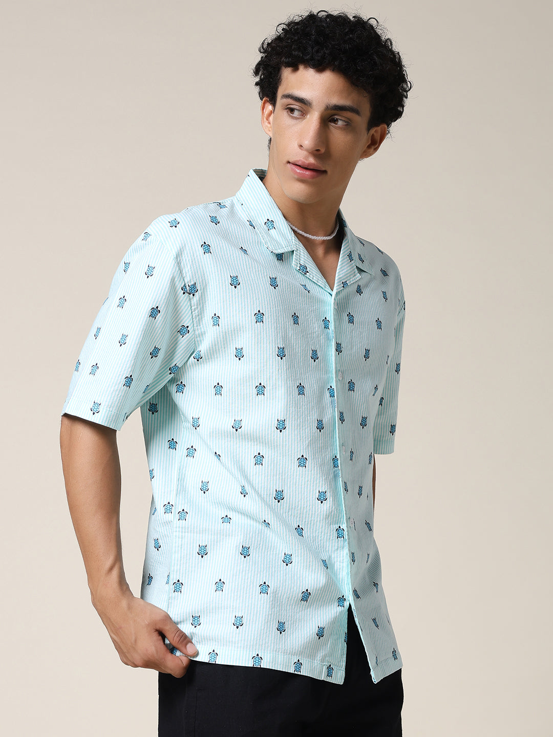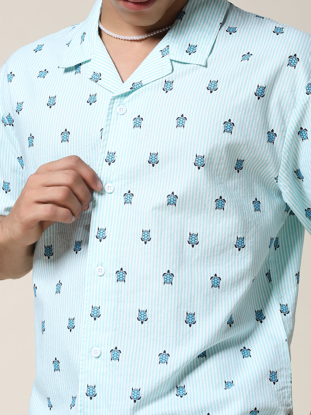 Stay cool and stylish with this Aqua Green half sleeve shirt for men featuring a playful turtle print. Made from soft fabric. it is perfect for casual wear or summer outings. Specifications Sleeve Length: Half Sleeve Fit: Relaxed Fit Collar: Cuban Collar Material: Cotton Fabric Pattern: Turtle Print with Thin Stripes Size: Model is wearing L size Country of Origin: Proudly Indian Washing Instructions: Machine wash. Color shown in the picture may vary from the actual product due to different lighting Product Description Get the best quality mens half sleeve casual shirt in aqua green color online at PRONK. Available in S to XXL size. Explore the trendy collection now!
