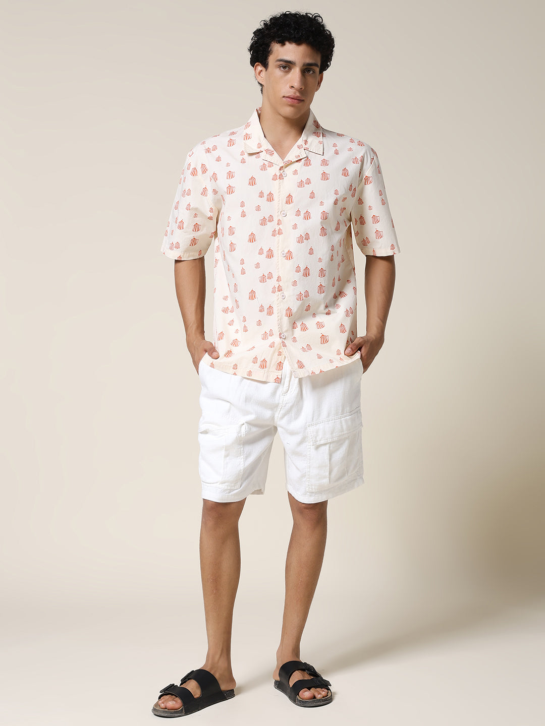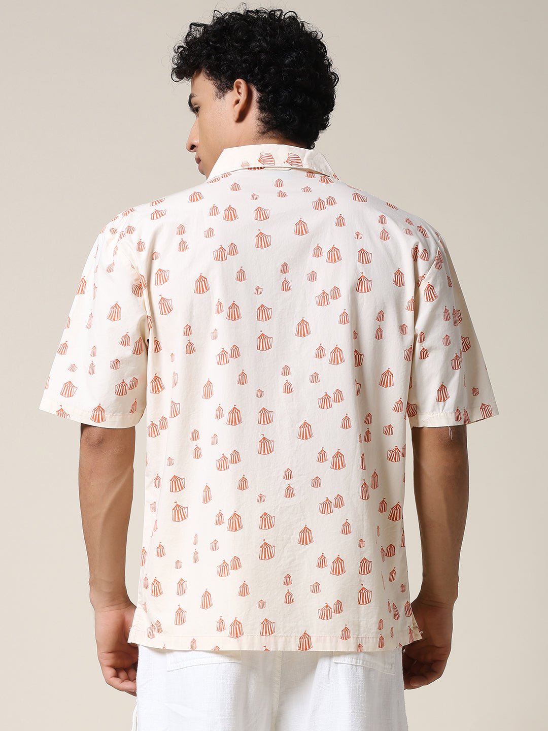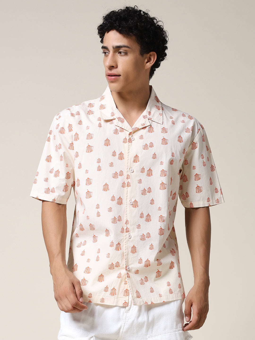 Stay cool and stylish with Beige half sleeve shirt for men featuring Orange Tent Print. Made from soft fabric. it is perfect for casual wear or summer outings. Specifications  Sleeve Type: Half Sleeve Fit: Relaxed Fit Pattern: Orange Tent Print Material: Cotton Fabric   Neck Style: Cuban Collar Closure: Front Button-Down Size: Model is wearing L size Country of Origin: Proudly Indian Washing Instructions: Machine wash.  Color shown in the picture may vary from the actual product due to different lighting Product Description Elevate your look with beige color mens half sleeve casual shirt. Buy online from PRONK at the best price available in S to XXL size. Shop online now!
