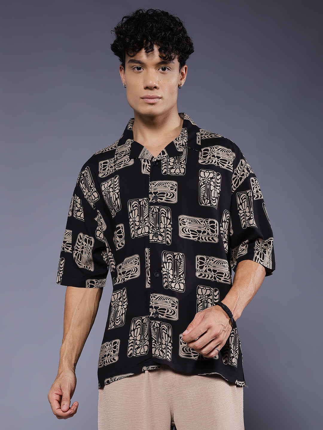 Stay cool and stylish with Black half sleeve shirt for men featuring relaxed fit and bold abstract design. Made from soft rayon fabric. it is perfect for casual wear or summer outings. Specifications  Sleeve Type: Half Sleeve Fit: Relaxed Fit Pattern: Breeze Material: Rayon Fabric   Neck Style: Cuban Collar Closure: Front Button-Down Size: Model is wearing L size Country of Origin: Proudly Indian Washing Instructions: Machine wash.  Color shown in the picture may vary from the actual product due to different lighting Product Description Buy men’s half sleeve casual shirt online from PRONK. Available in XS to XL size. Choose from the wide collection of men’s half sleeve casual shirts.