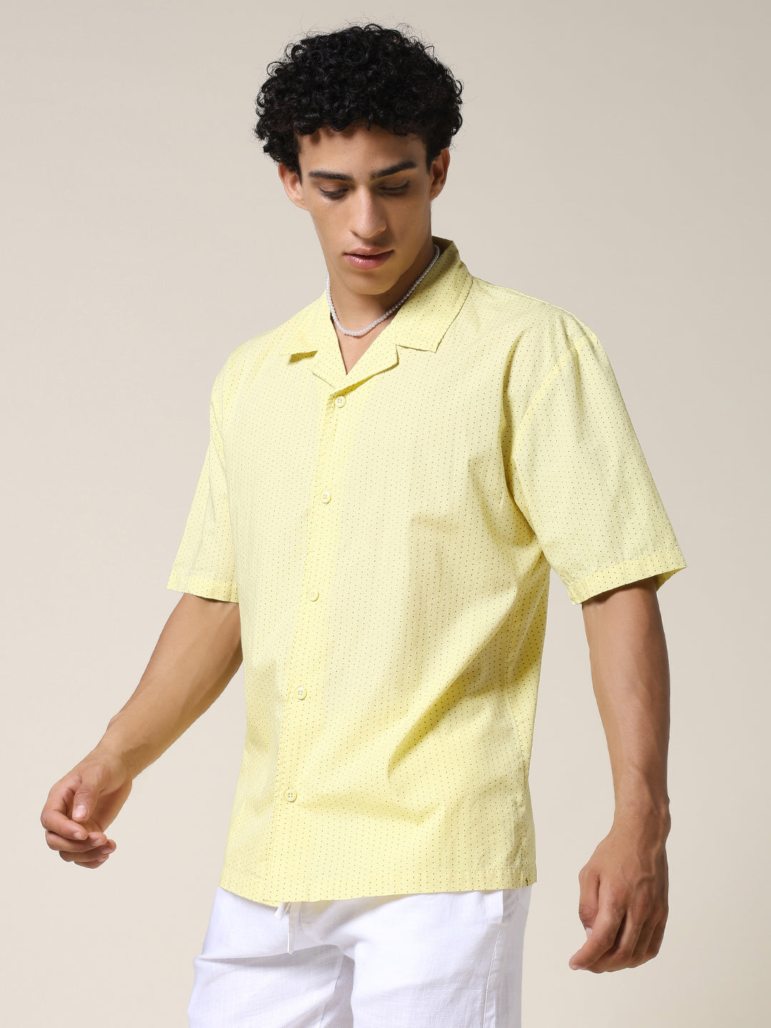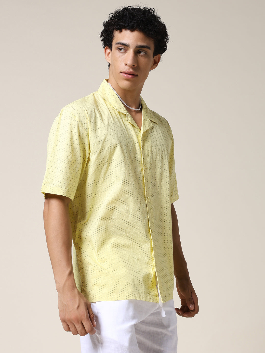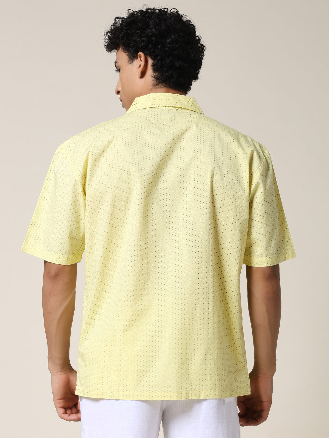 Stay cool and stylish with Yellow half sleeve shirt for men featuring Small Black Dots Print. Made from soft fabric. it is perfect for casual wear or summer outings. Specifications Sleeve Type: Half Sleeve Fit: Relaxed Fit Pattern: Small Black Dots Print Material: 100% Cotton Fabric Neck Style: Cuban Collar Closure: Front Button-Down Size: Model is wearing L size Country of Origin: Proudly Indian Washing Instructions: Machine wash. Color shown in the picture may vary from the actual product due to different lighting Product Description Shop yellow color mens half sleeve casual shirt online from PRONK. Available in S to XXL size. Choose from the wide collection online at PRONK. Shop now!