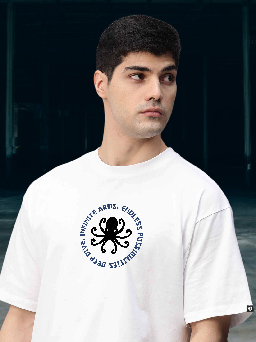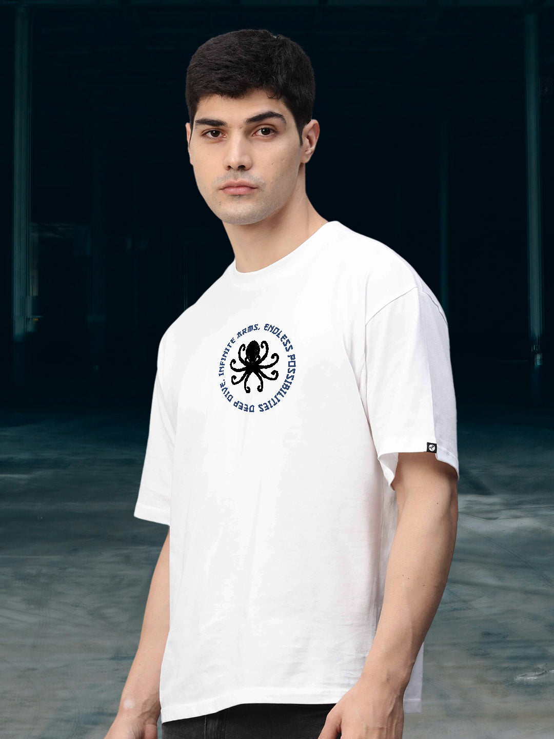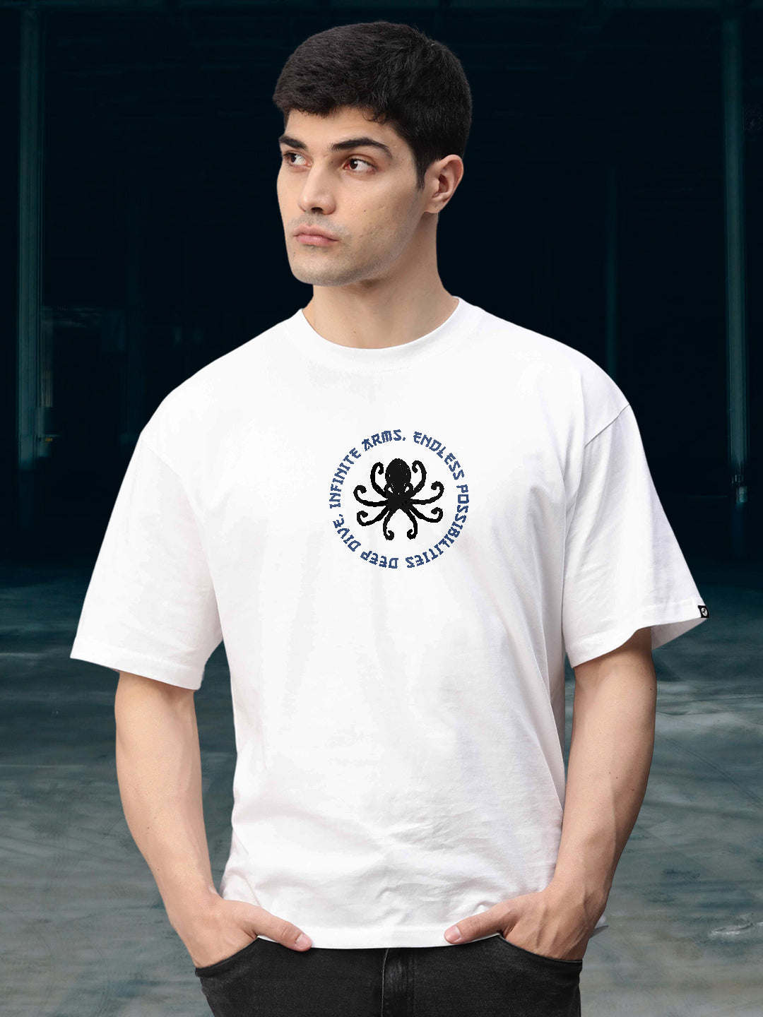 Product Description Half Sleeves Crew Neck 200 GSM Fabric Fit: Oversized Fit Fabric: 100% Premium Cotton | Sustainable 2X stronger cotton thread used Size: Model is wearing L size Country of Origin: Proudly Indian Washing Instructions: Machine wash. Do not iron directly or scrub on print. Dry on flat surface as hanging may cause measurement variations Color shown in the picture may vary from the actual product due to different lighting Upgrade your wardrobe with our white color ocean ranger men oversized printed t-shirt available in XS,S,M,L,XL,XXL size. Choose from the PRONK’s trendy collection of oversized t-shirts. Buy now!