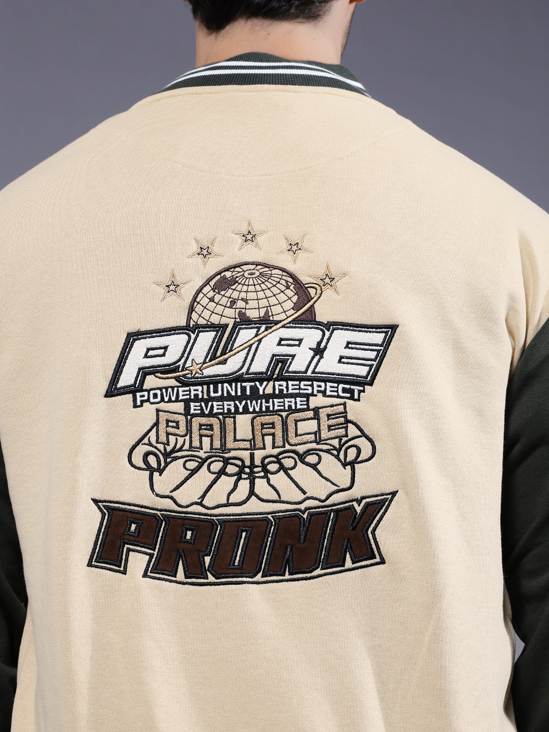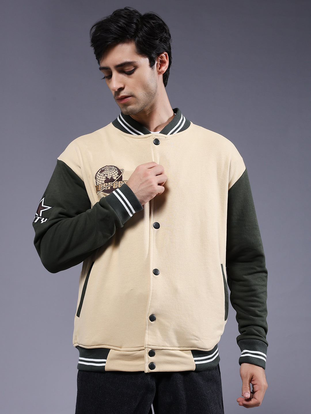 Step up your casual style with beige color Respect Men Varsity Embroidered Bomber Jacket featuring bold embroidery prints and striped ribbed detailing. Perfect for everyday wear, parties, or street fashion. Specifications  Sleeve Type: Full Sleeve Fit: Relaxed Fit Pattern: Embroidered  Material: 100% Cotton Terry  Neck Style: Ribbed Baseball Collar Closure: Front Button-Down Size: Model is wearing L size Country of Origin: Proudly Indian Washing Instructions: Machine wash.  Color shown in the picture may vary from the actual product due to different lighting Product Description Shop men Embroidered varsity bomber jacket  from Pronk online with free worldwide shipping. Choose from a wide range of trendy designs Jackets for men. Available in S,M,L,XL. Buy now!