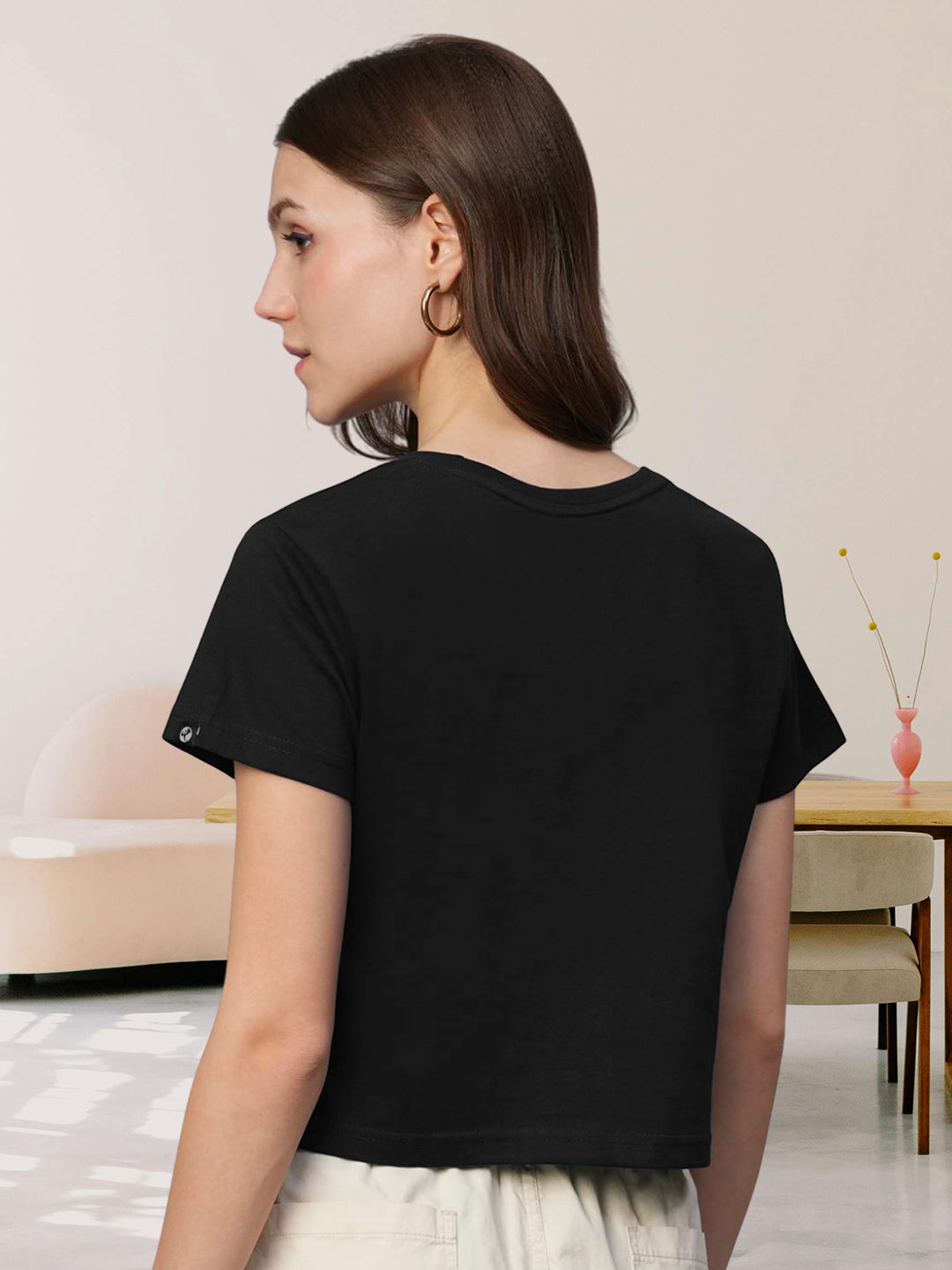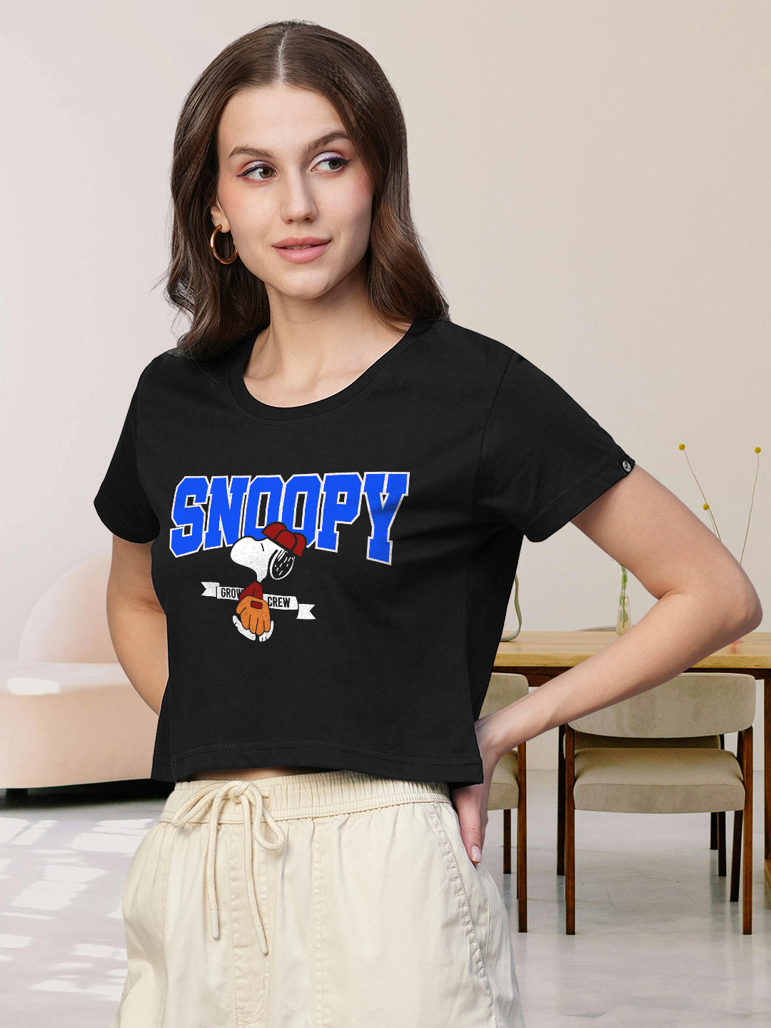 Half Sleeves Crew Neck 180 GSM Fabric Fit:  Regular Fit Fabric: 100% Premium Cotton | Sustainable 2X stronger cotton thread used Size: Model is wearing M size Country of Origin: Proudly Indian Washing Instructions: Machine wash. Do not iron directly or scrub on print. Dry on flat surface as hanging may cause measurement variations Color shown in the picture may vary from the actual product due to different lighting Product Description Shop Snoopy Women Printed Crop Top by Pronk online Buy in India. Choose an extensive collection of black color. Available in sizes XS, S, M, L, XL. Check out vast collection of women printed crop top with premium quality.