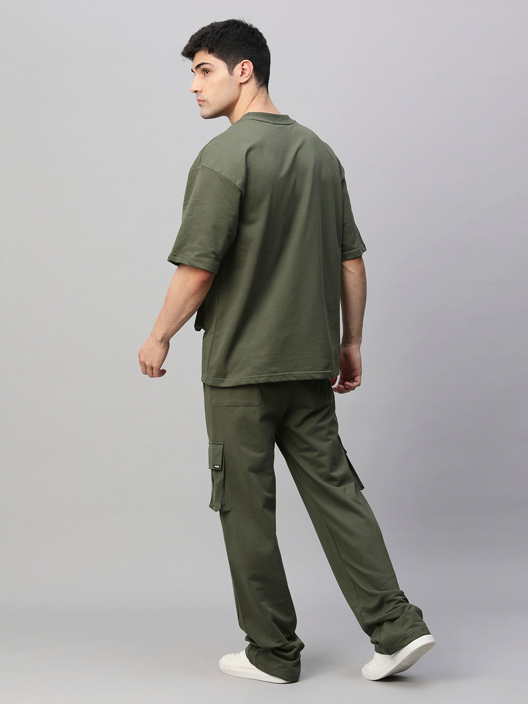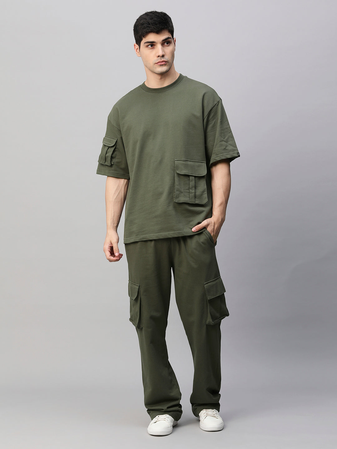 Co-ord Set Top : 240 GSM Bottom: 240 GSM Fit: Relaxed Fit Fabric: 100% Premium Cotton Terry Size: Model is wearing L size Country of Origin: Proudly Indian Washing Instructions: Machine wash. Do not iron directly or scrub on print. Dry on flat surface as hanging may cause measurement variations Contents: Package Contains 1 Cargo T-Shirt And 1 Cargo Shorts Product Description Elevate your look with olive green streetwear cargo co-ord set for men made of 100% premium cotton terry online in India at Pronk. Available in s, m, l , xl sizes. Explore more latest trendy designs of mens co-ord sets online at PRONK.