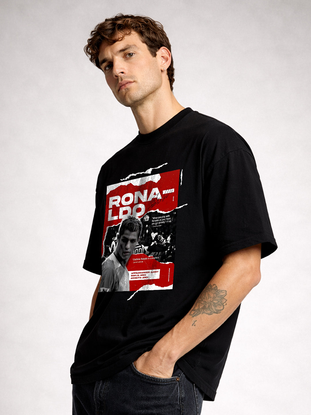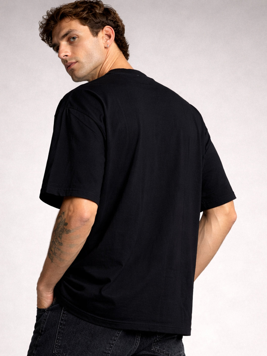 Product Detail : Oversized Fit Printed / Graphic print Crew neck Half sleeves Fit: Oversized Fit Fabric: 100% Premium Cotton | Sustainable 2X stronger cotton thread used Size: Model is wearing L size Country of Origin: Proudly Indian Washing Instructions: Machine wash. Do not iron directly or scrub on print. Dry on flat surface as hanging may cause measurement variations Color shown in the picture may vary from the actual product due to different lighting Product Description Elevate your looks with black color Men Printed Oversized T-Shirt. Buy online now from PRONK, available in XS to XXL size. Free worldwide shipping!
