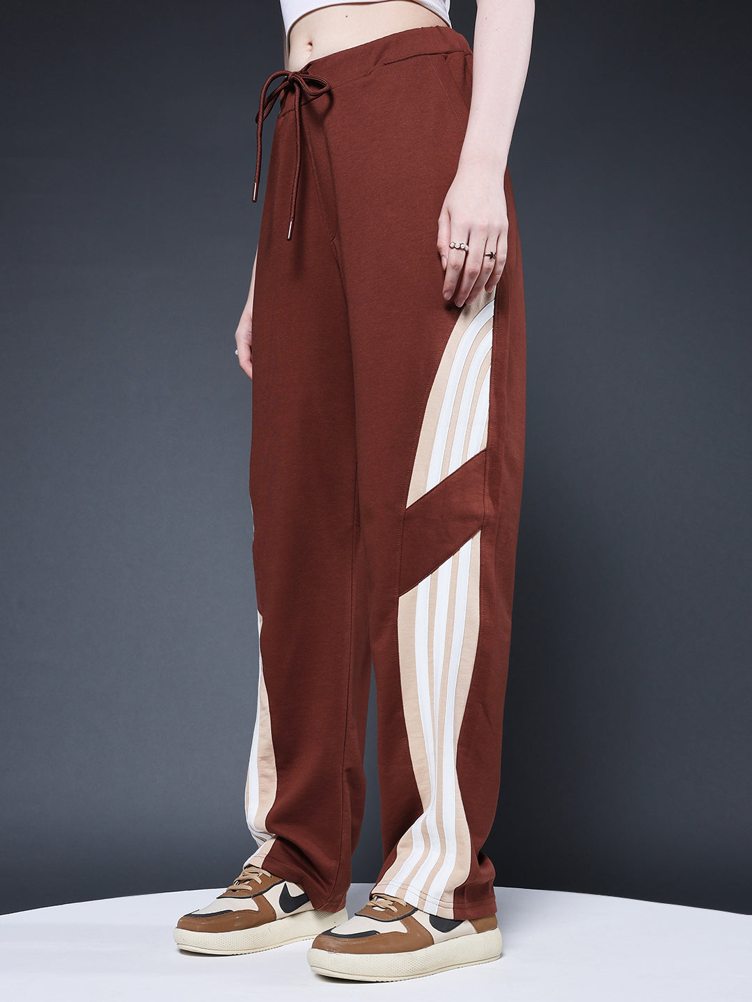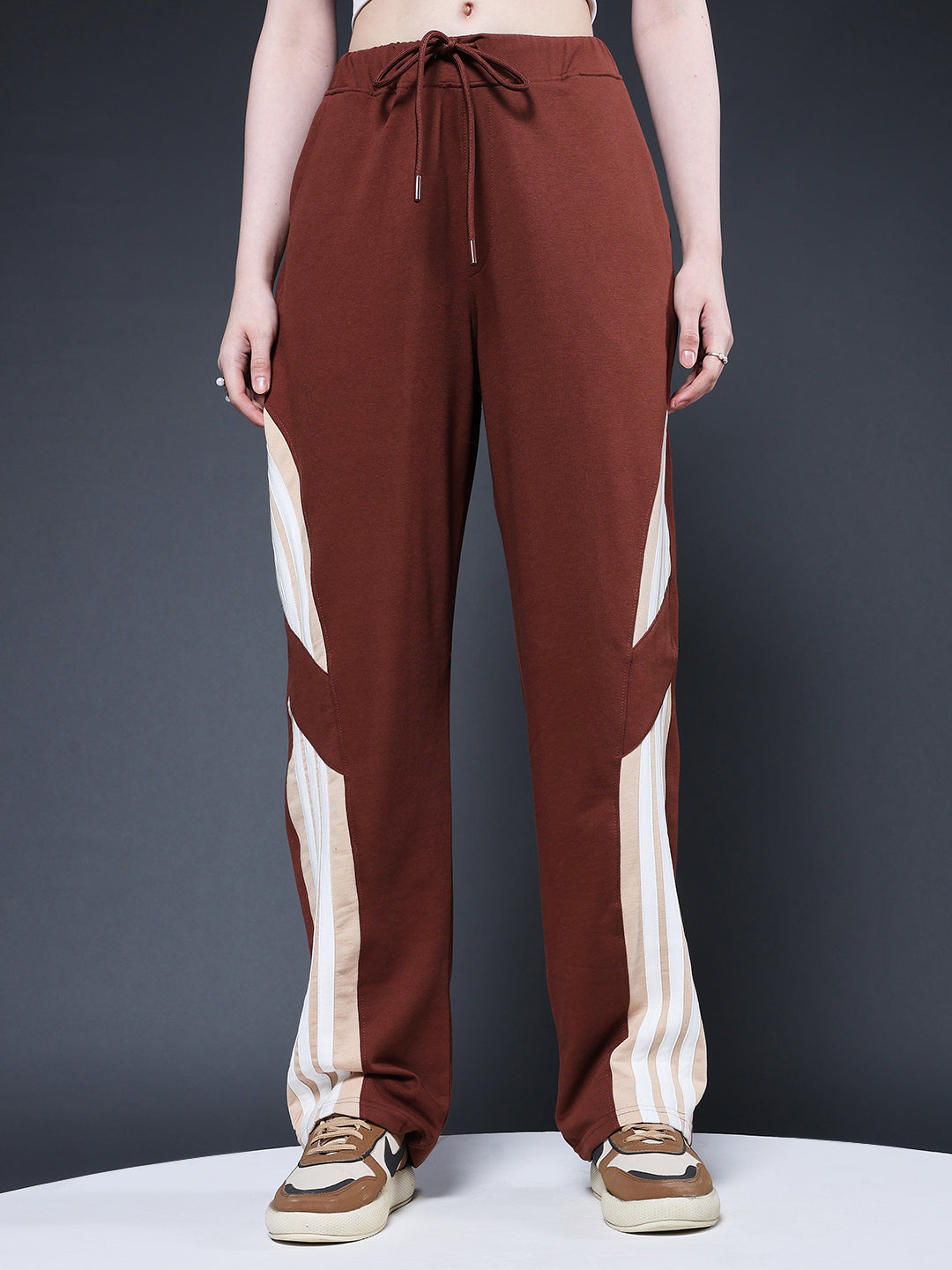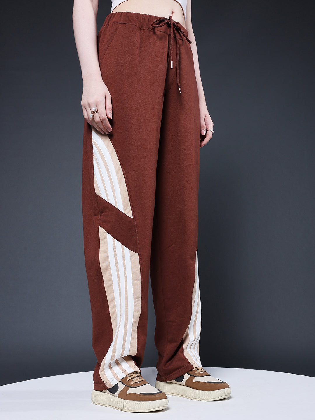 Stay comfortable and stylish with these relaxed-fit women premium jogger with side stripes, It offer the perfect combination of fashion and function. Specifications Fit: Relaxed Fit Composition: 60% cotton 40% polyester Material: French Terry Waistband: Elasticated with Drawstring Pockets: 2 side pockets, 1 Back Pocket Size: Model is wearing L size Country of Origin: Proudly Indian Washing Instructions: Machine wash. Do not iron directly or scrub. Dry on flat surface as hanging may cause measurement variations Color shown in the picture may vary from the actual product due to different lighting Product Description Get the cocoa color best women premium terry jogger with side stripes online from PRONK. Available in 30 to 36 size. Buy now free worldwide shipping!